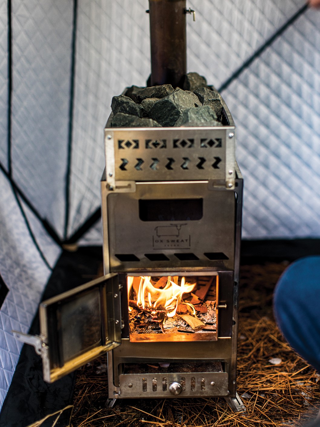 To use: Make sure to select a location that’s flat, stable and away from anything flammable. “Set up the tent a safe distance away from any buildings or trees,” Simmons says. “You’re burning wood, so it’s a good idea to be aware of your surroundings.” Bring rocks to lay on top of the stove’s grate, kindling and dry hardwood to light the fire. “Five-gallon buckets work well to carry wood and rocks, and two of them can also double as a sauna bench with a 2 by 6 [foot] board on top,” Simmons says. Inside temperature can be controlled by adjusting ventilation and the amount of wood burning.