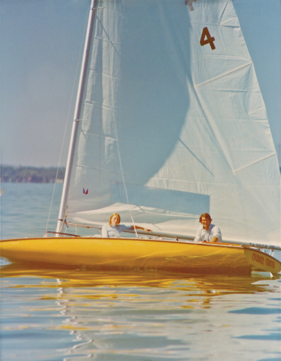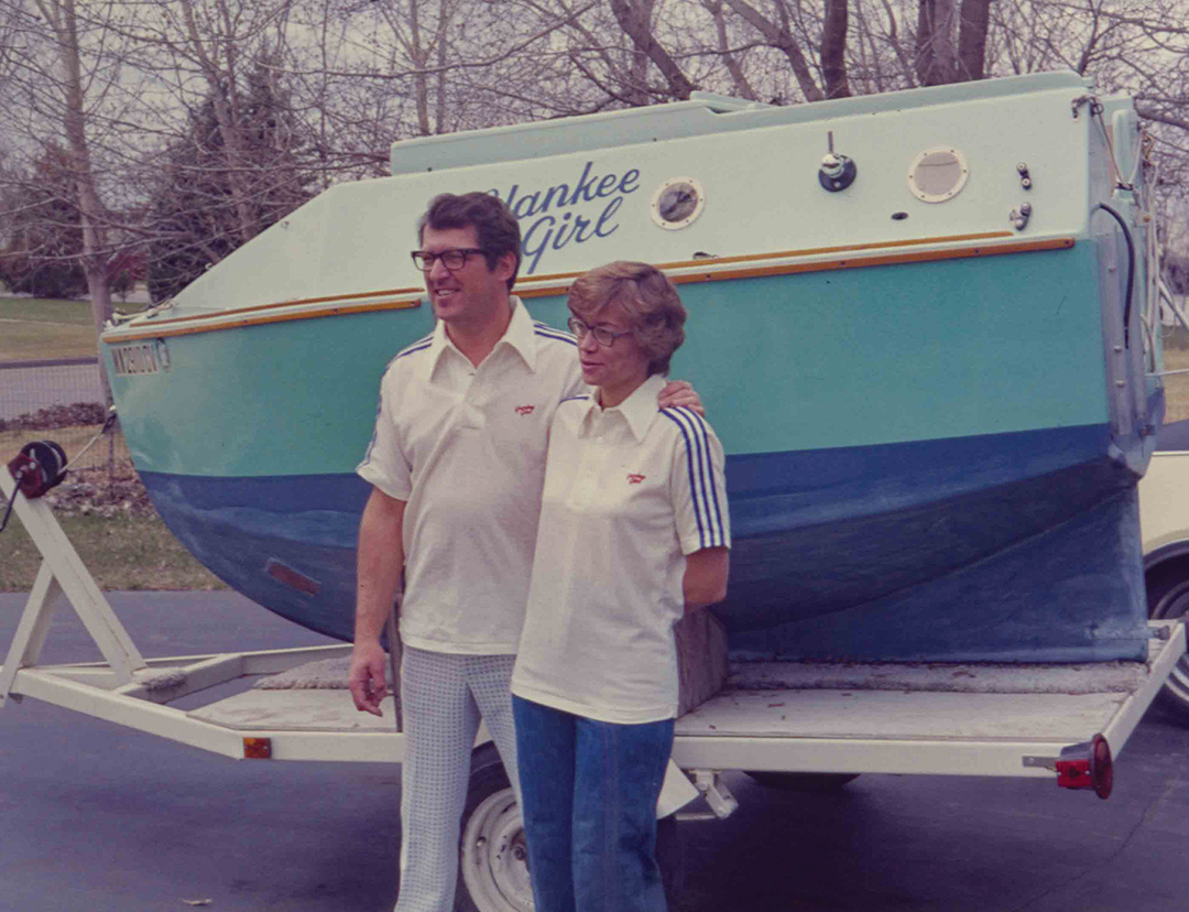 Jay Rendall and his wife, Penny, in their sailboat, Orange Crate, before a race on Lake Mendota in Madison, Wisconsin. “Penny was my crew,” Rendall says. “We were racing, but there was hardly any wind that day.” Penny and Jay in a Johnson C Scow, 1977. Photo: Rendall Family