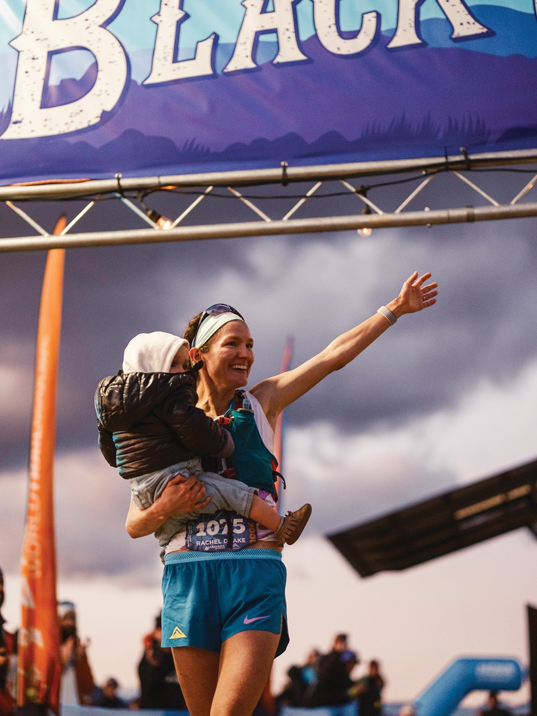 To date, Drake has raced in 25 ultramarathons. In February 2024, she won the Black Canyon 100K in Arizona, one of the most competitive trail races in North America. The race ended in a truly adorable fashion. “My parents were there watching Lewis, and my dad handed him off to me before I crossed the finish line,” Drake says.
